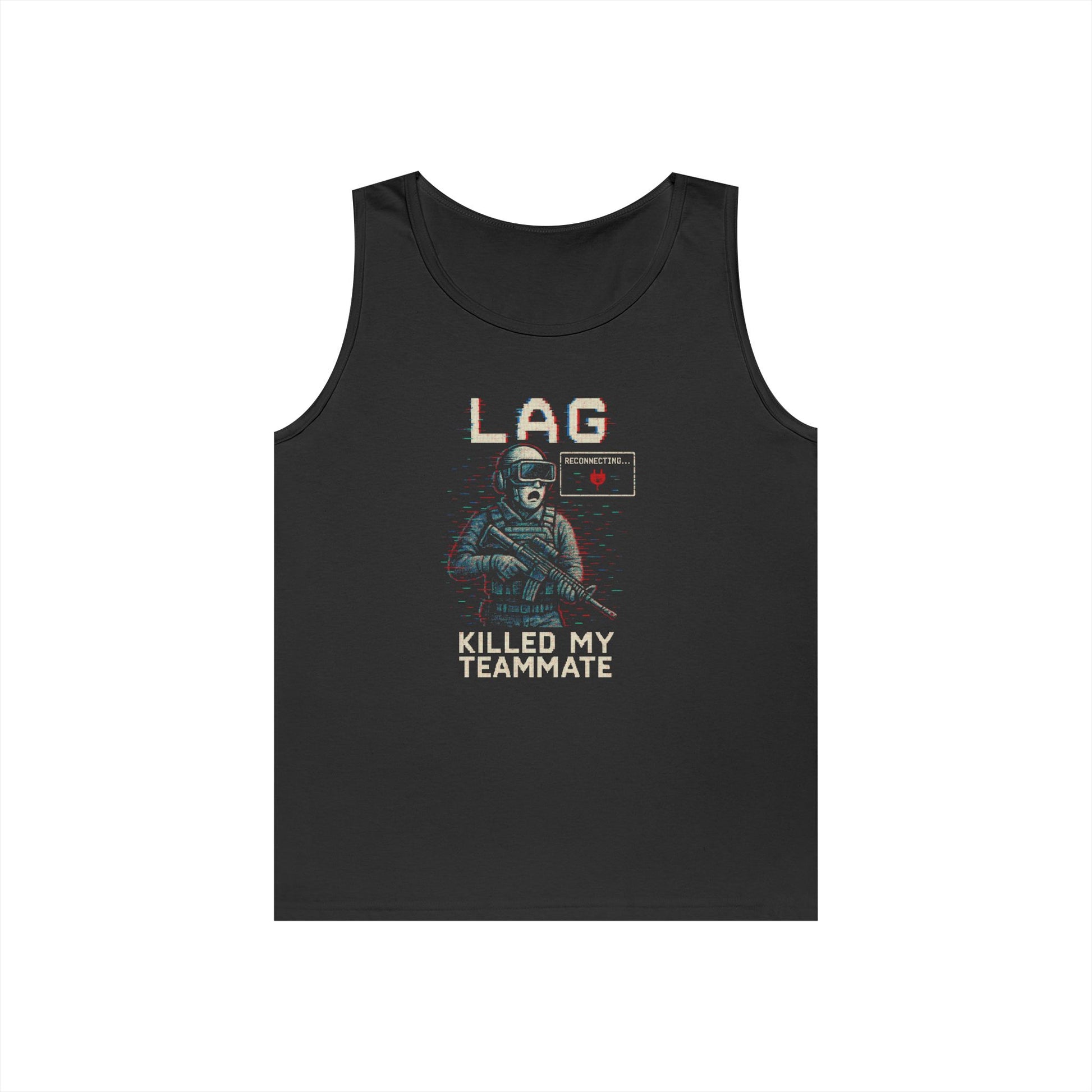 Whether you're sweating it out at the gym or respawning after a lag-induced disaster, the "Lag Killed My Teammate" unisex tank top has your back—literally. Featuring a glitch-art inspired design that every gamer can relate to, this tank top is built for comfort, durability, and letting the world know who really took your teammate out.